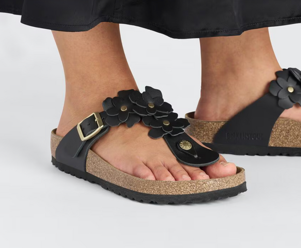 Birkenstock | Gizeh | Black Leather w/ Flower Embellishment