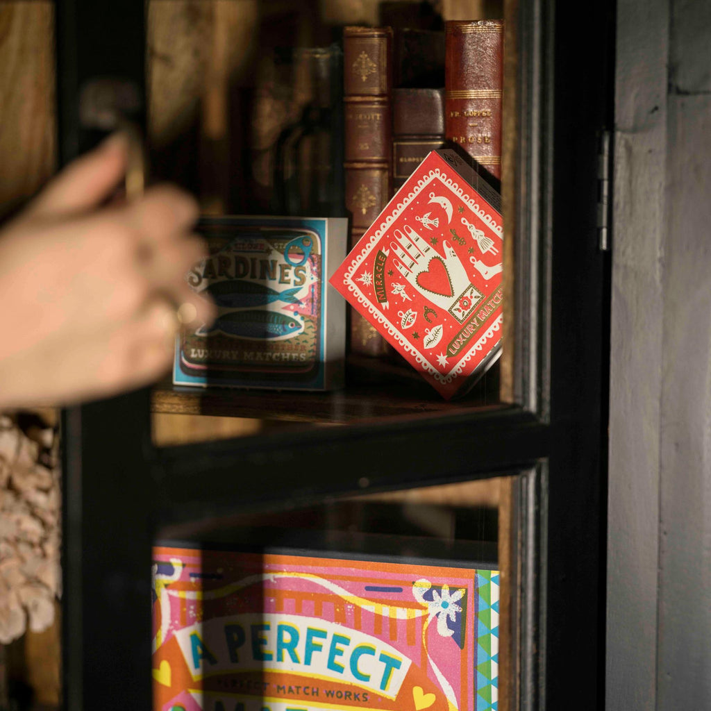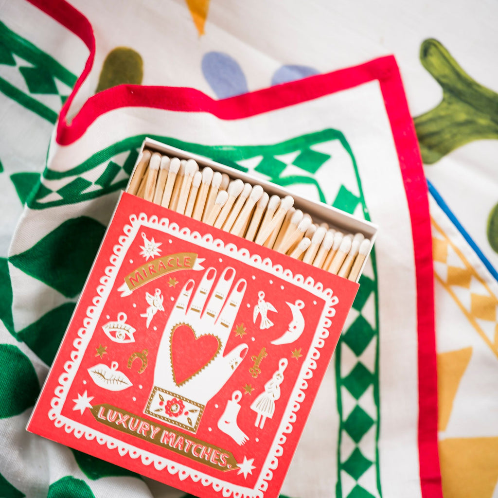 Our signature square matchbox featuring the illustration of a hand with a heart in the middle surrounded by an array of different charms and gold foil detailing with the words 'Miracle Luxury Matches.'