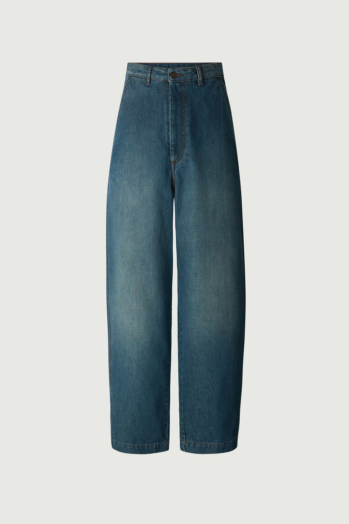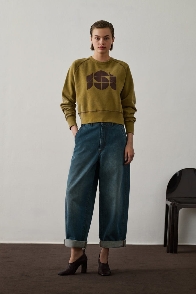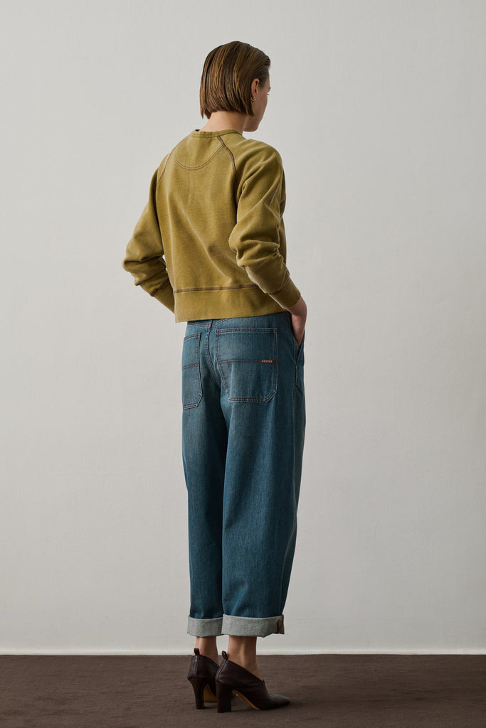 - Dye on cotton with subtle shades of green, visible mainly under certain lighting or with the jeans' wear