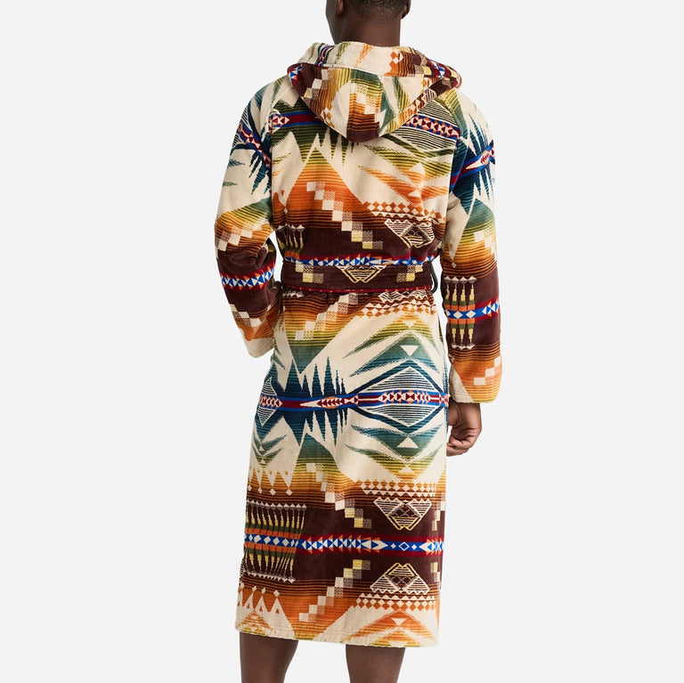 A plush, pure cotton wrap robe that's velvety soft outside, with absorbent loops inside. Features our Mystic Lake pattern. Generous hood, two deep pockets and a self-fabric waist tie. Unisex fit. OEKO-TEK and GOTS certified.