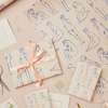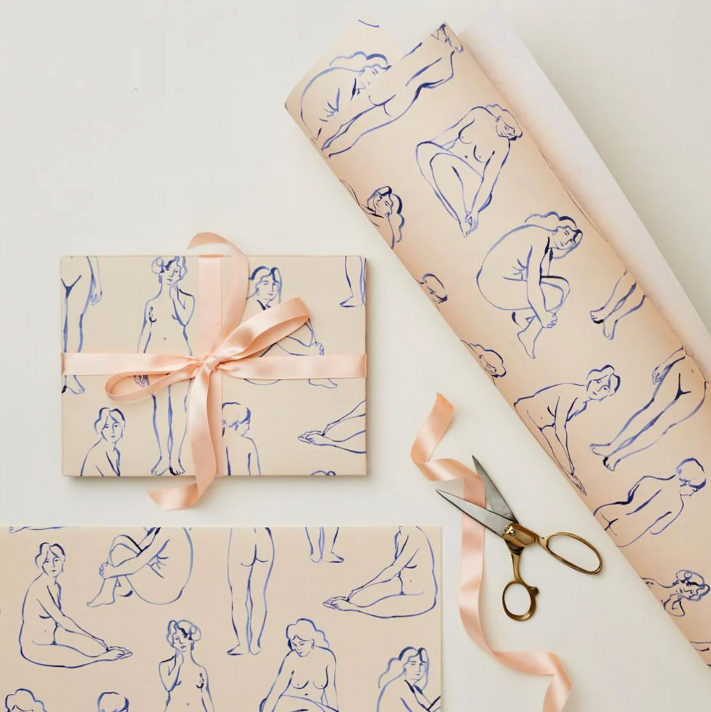 Our patterned papers are printed in the U.K. using the finest quality 100 gsm paper and measures 500mm x 700mm. This joyful design features painted blue nudes on a blush pink background colour. A matching greetings card is also available.