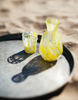 This playful glass jug in yellow, white, clear glass is mouth-blown in firozabad, the centre of india’s glass industry. Unique coloured spots and humorous expression add character to any table setting. Made from partially recycled glass using a handmade hot-glass process, this glass jug has subtly varied decorative spots and pairs beautifully with matching drinking glasses.