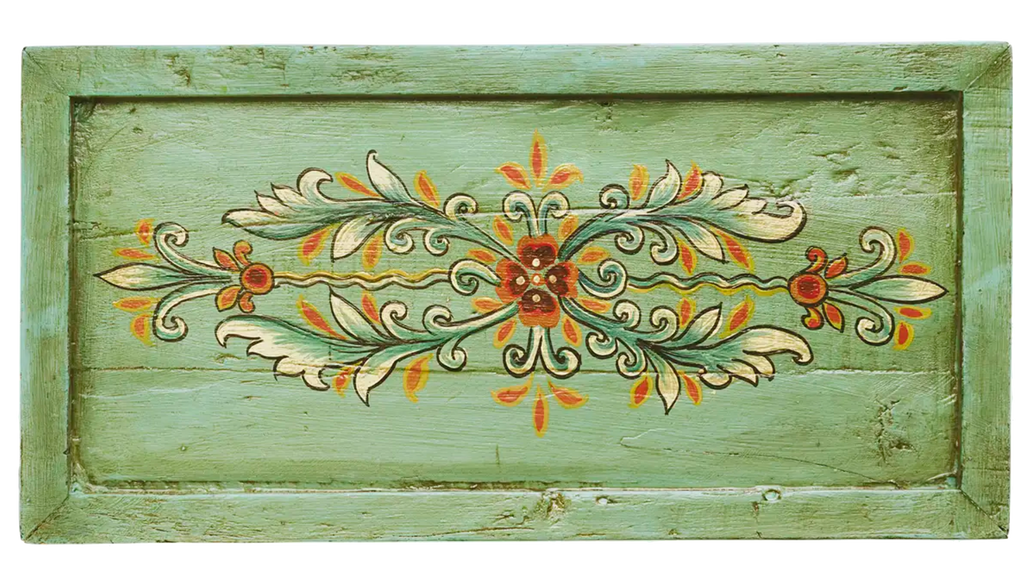 This tray, crafted in Jodhpur, India, exemplifies the area's skilled craftsmanship using recycled wood. Featuring an aqua, off-white, orange, and black palette, it highlights sustainable artistry. Originally part of a building, its cracks and irregularities add unique charm. Suitable for serving, wall decoration, or as a display for small plants and candles, this folklore-inspired design enhances any environment. Variations occur due to its handmade and recycled nature.