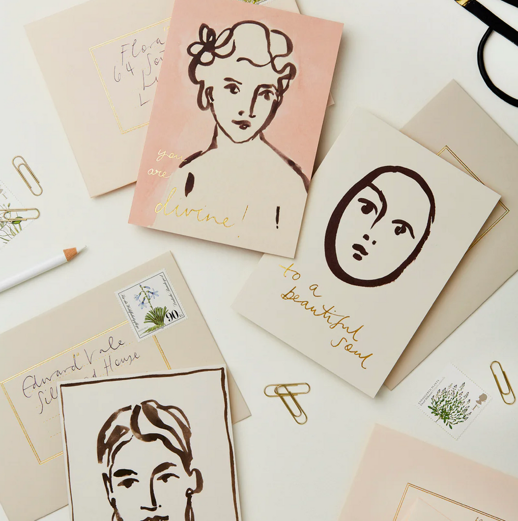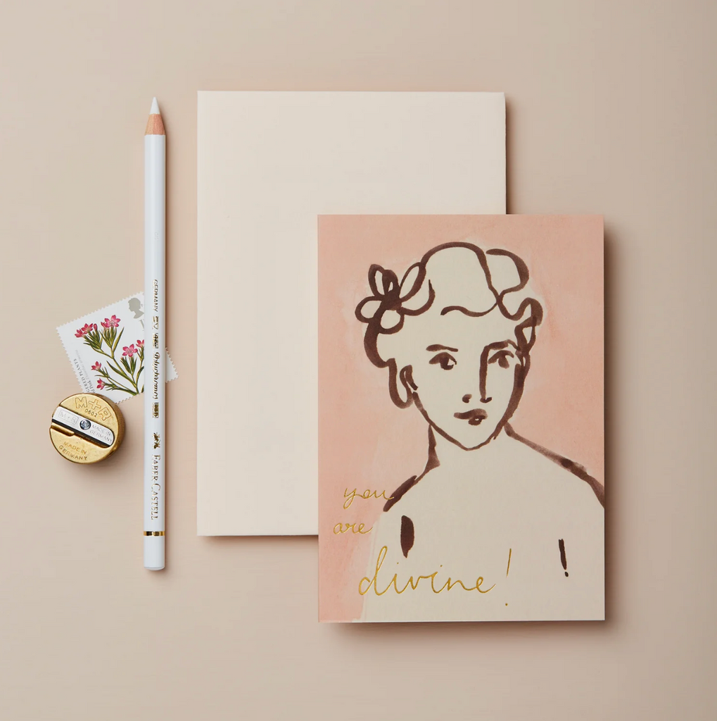 Our Portrait collection is a range of contemporary designs which feature painterly illustrations of people and faces. This card reads 'You Are Divine' and features golden foil on the front and back of the card. Paired with a luxury blush pink envelope.