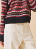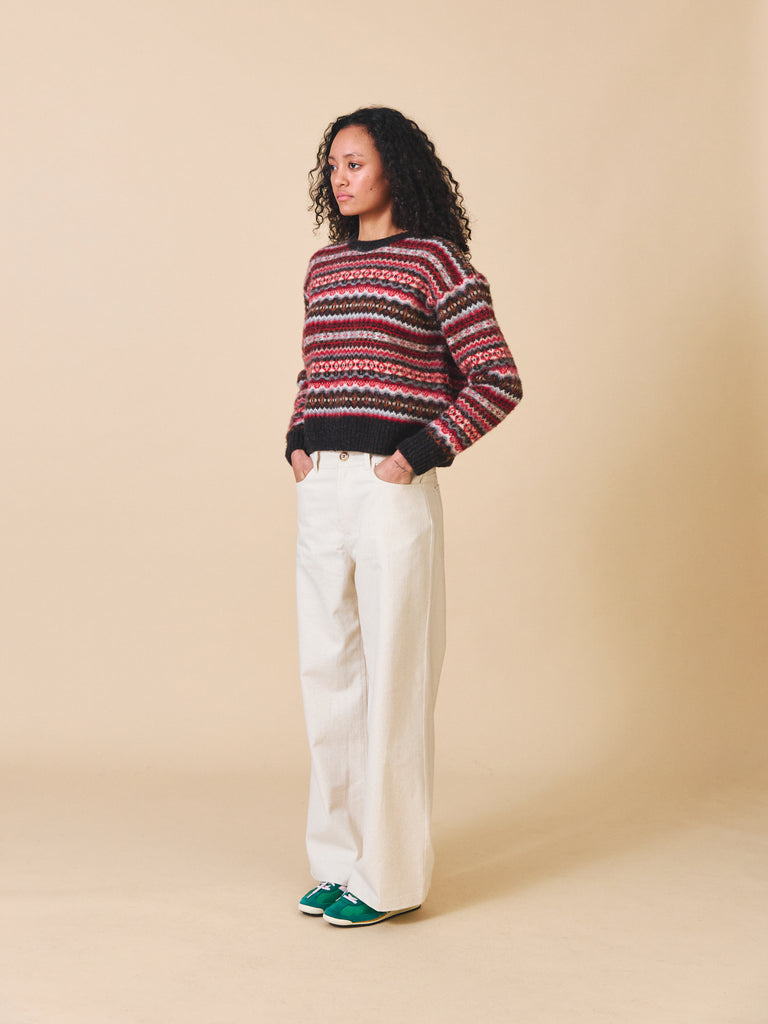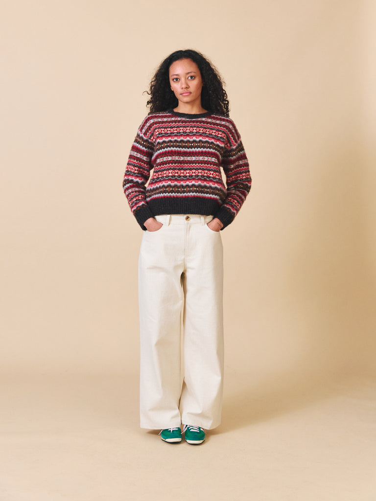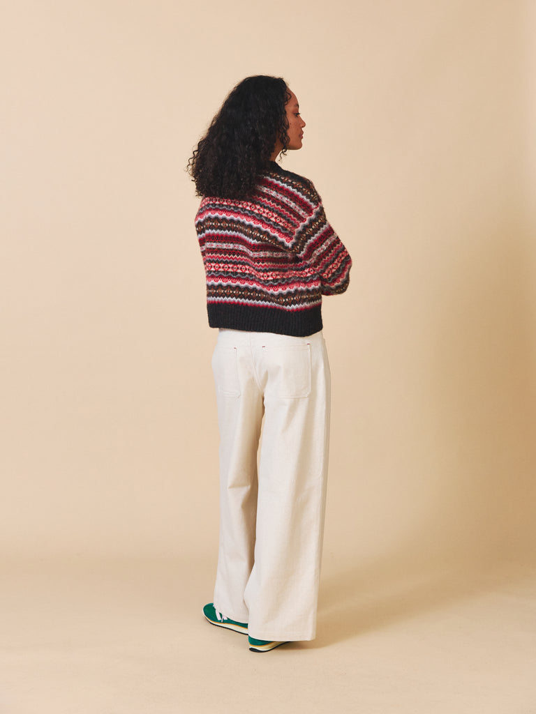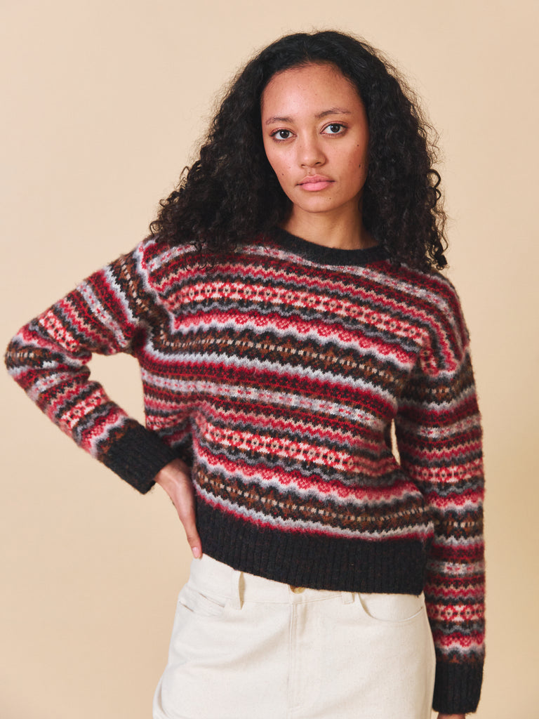 The Poppy Jumper is made from 100% wool. This style is made using traditional fair Isle pattern in our unique modern colourways. The surface of this style has been brushed giving is a cosy, fuzzy texture. This silhouette is slightly cropped and boxy with a dropped shoulder and deep ribbed hem/cuffs.
