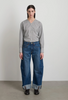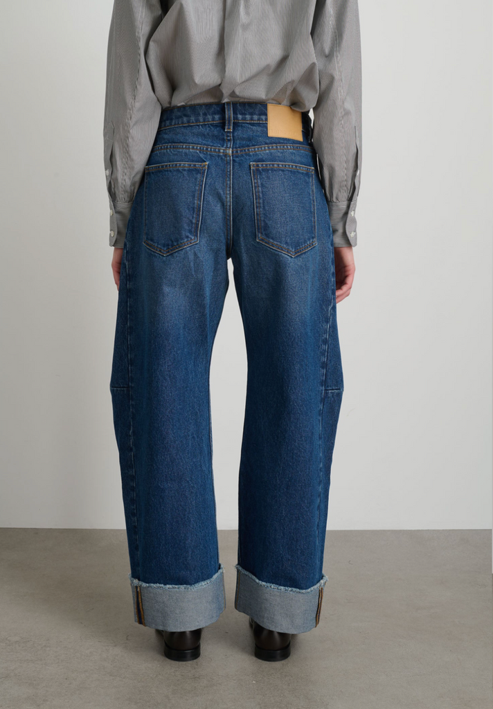 Our popular Lasso Jean cut from heavy cotton rich denim then finished for a relaxed structured look. Designed to sit at the natural waist with a pieced outseam, kinked leg shape, long length and flat-felled finishing. The raw hemline may be worn long or cuffed.