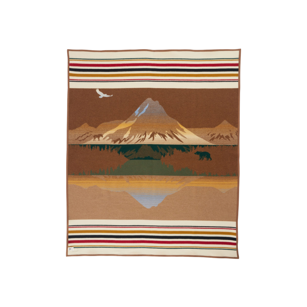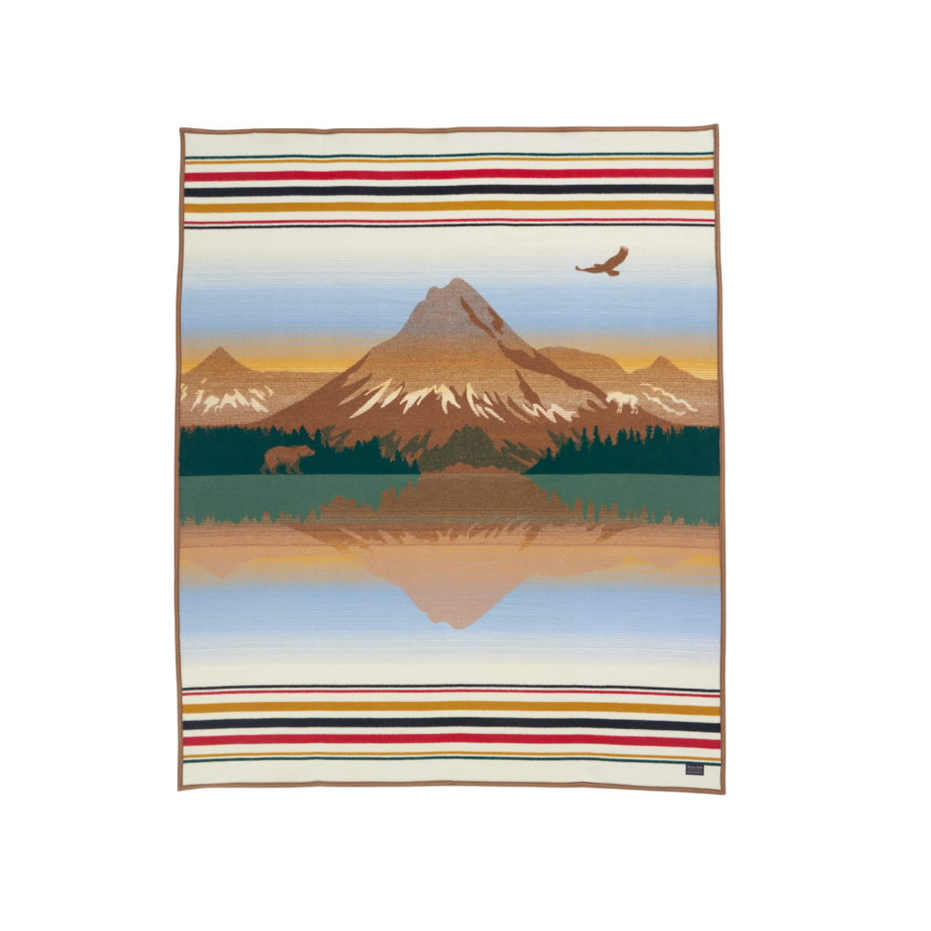 This blanket honors Montana’s Glacier National Park, home to 26 named glaciers. In this design, a still lake reflects an ice-topped mountain and the skies above in soft ombré tones, while an eagle soars overhead. Glacier was the first park celebrated with a Pendleton blanket in the early 1900s. Border stripes echo the simple stripe of earlier blankets.