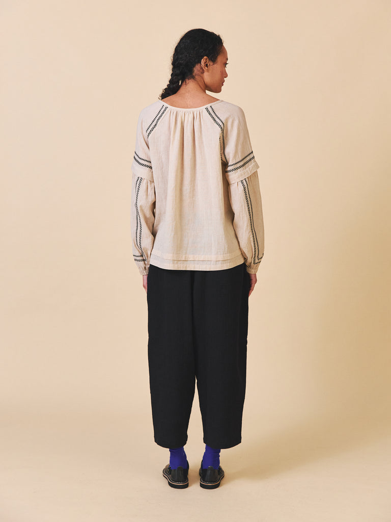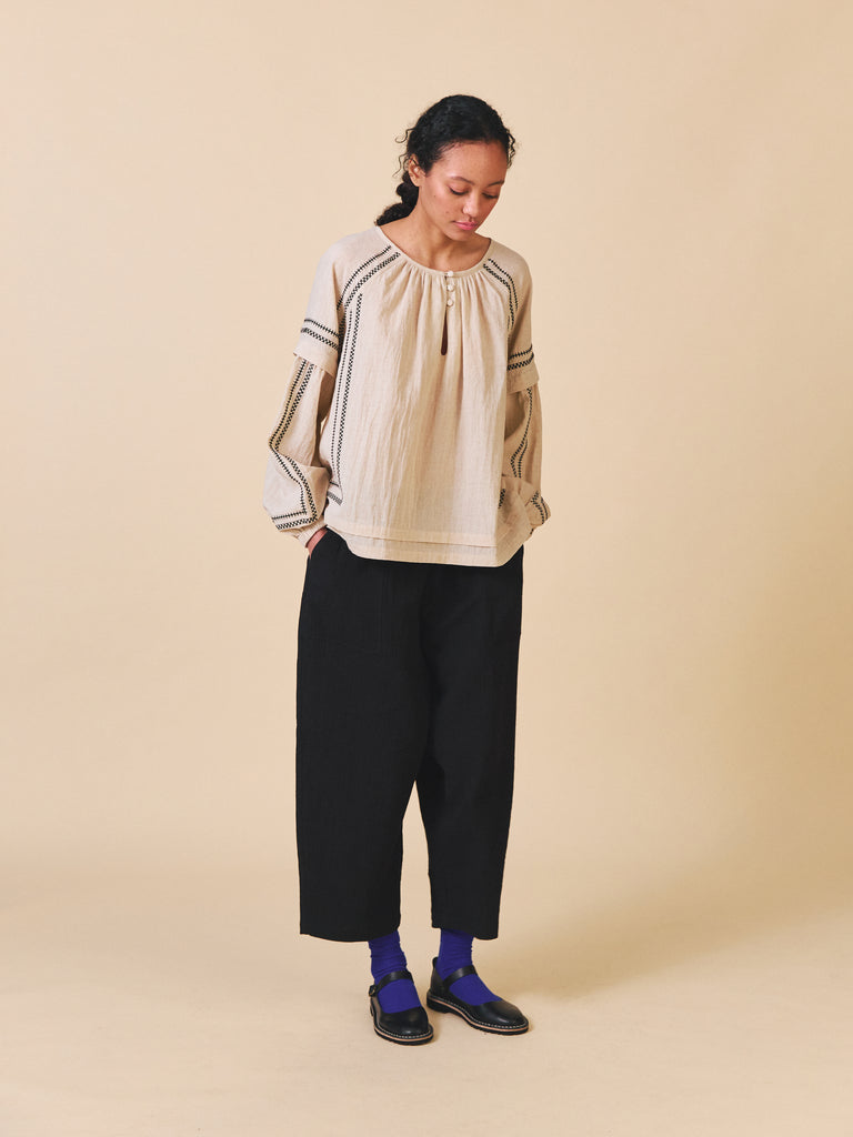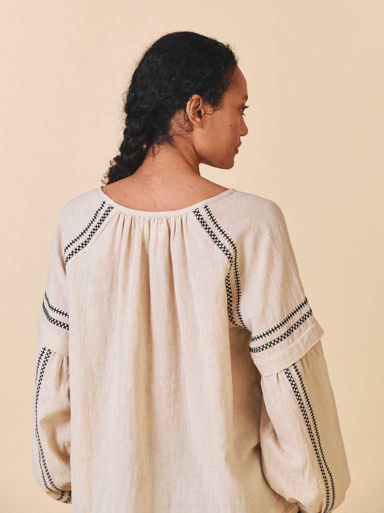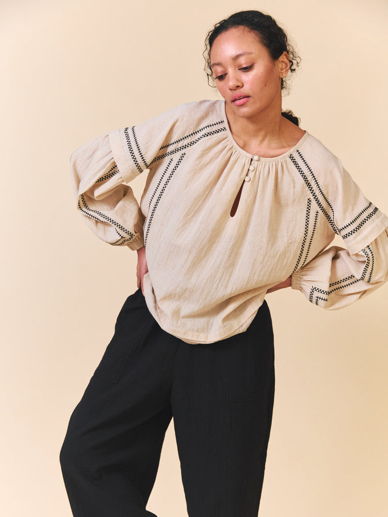 The Elodie Shirt is made from a beautiful light weight cotton linen with a lovely drape and texture.This style features a beautiful embroidery design, pleats and a gathered neckline. Loose fitting with an open rounded neck and keyhole with buttons. The Sleeves have a pleat with fullness into a buttoned cuff.